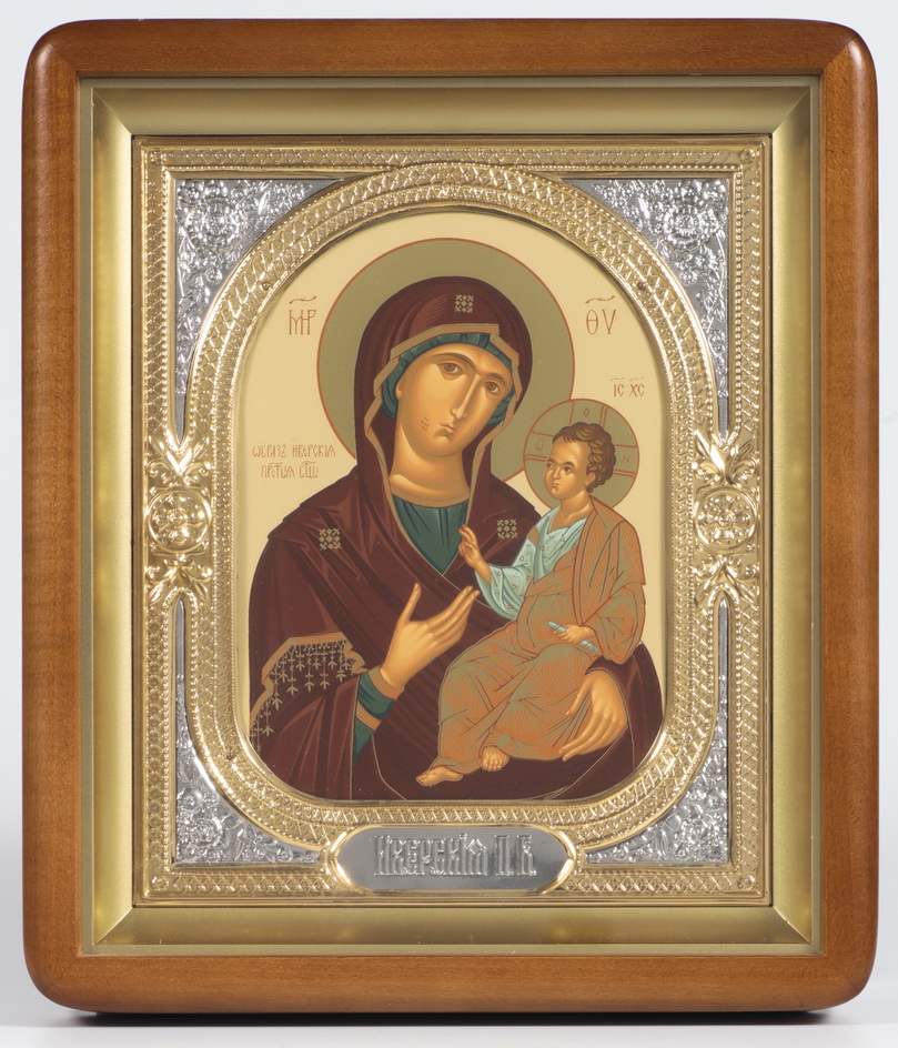 Икона в киоте 18х24 фигурный, темпера, риза-рамка объемная, открытая, золочёная, никелирование Иверская БМ