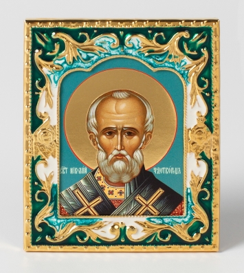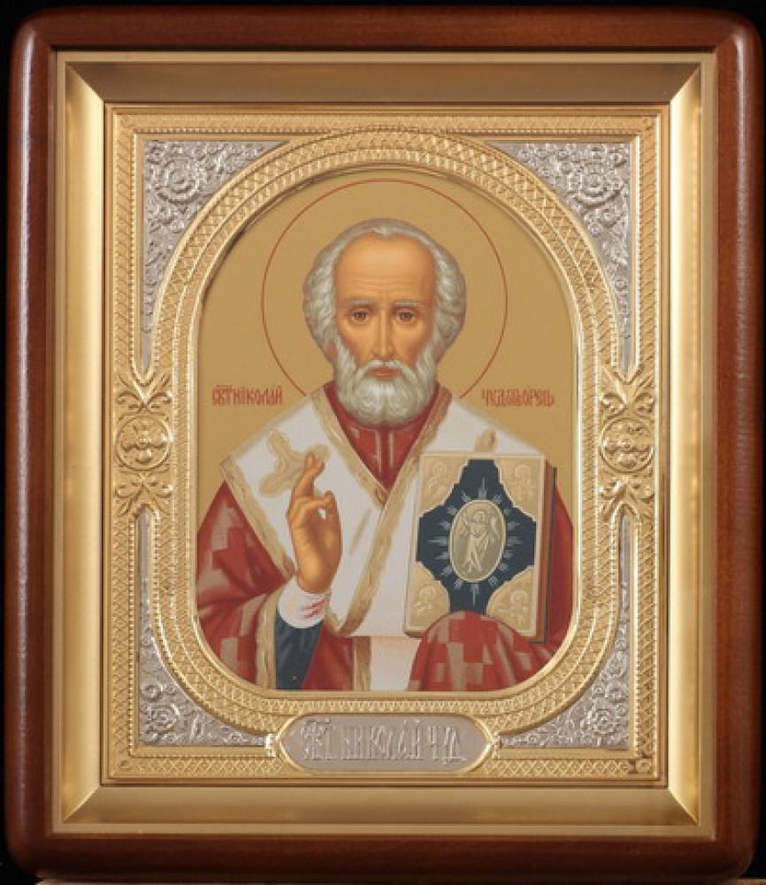 Икона в киоте 18х24 фигурный, темпера, риза-рамка объемная, открытая, золочёная, никелирование Николай Чудотворец 1