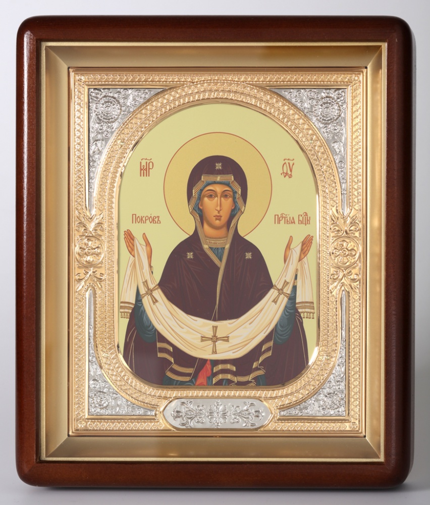Икона в киоте 18х24 фигурный, темпера, риза-рамка объемная, открытая, золочёная, никелирование Покров