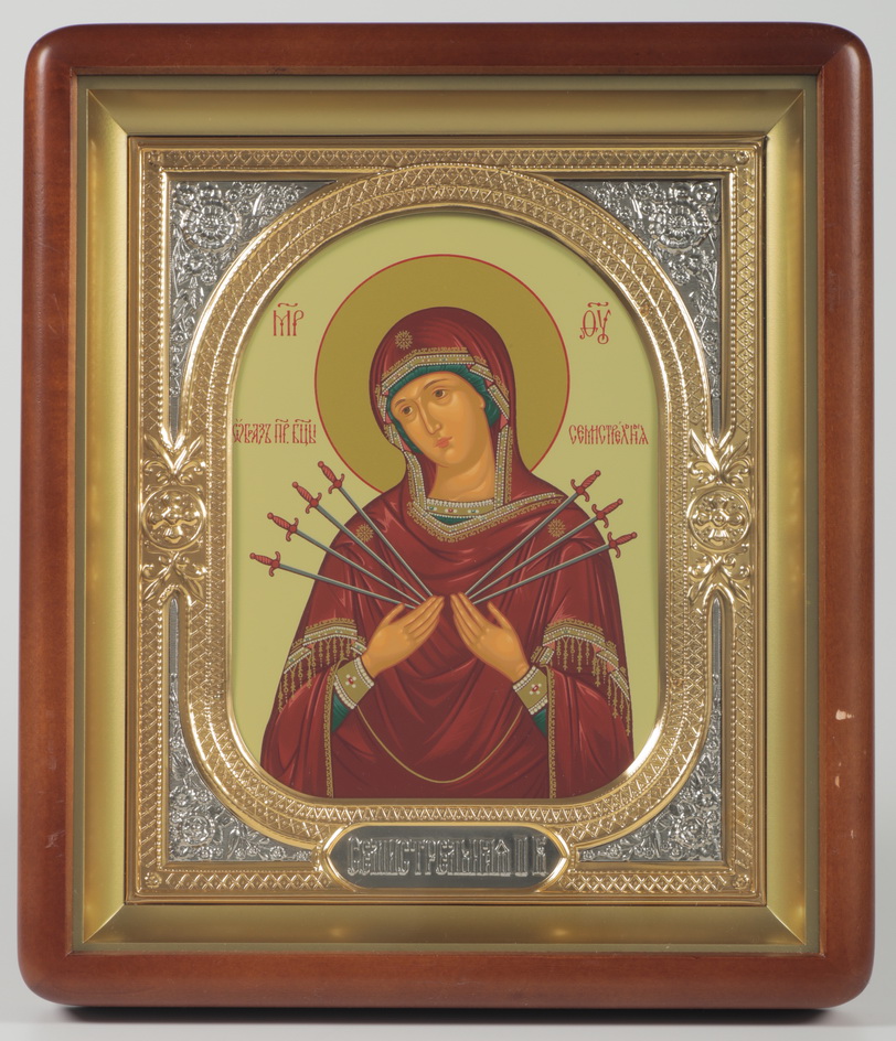 Икона в киоте 18х24 фигурный, темпера, риза-рамка объемная, открытая, золочёная, никелирование Семистрельная БМ 1