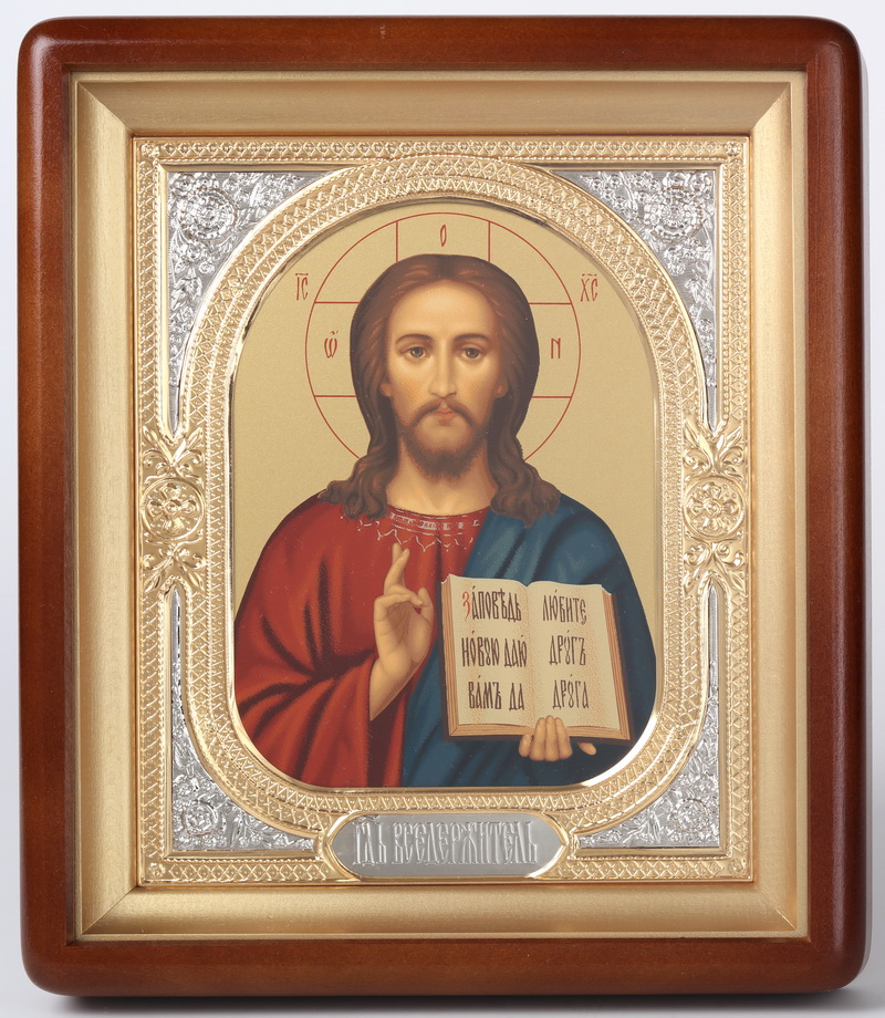 Икона в киоте 18х24 фигурный, темпера, риза-рамка объемная, открытая, золочёная, никелирование Спаситель 1