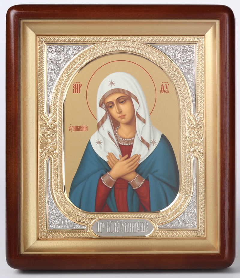 Икона в киоте 18х24 фигурный, темпера, риза-рамка объемная, открытая, золочёная, никелирование Умиление 1