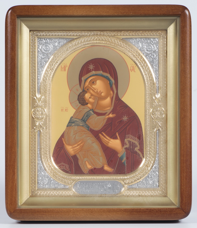 Икона в киоте 18х24 фигурный, темпера, риза-рамка объемная, открытая, золочёная, никелирование Владимирская БМ