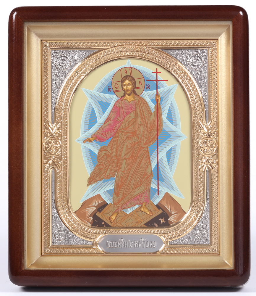 Икона в киоте 18х24 фигурный, темпера, риза-рамка объемная, открытая, золочёная, никелирование Воскресение Христово 1