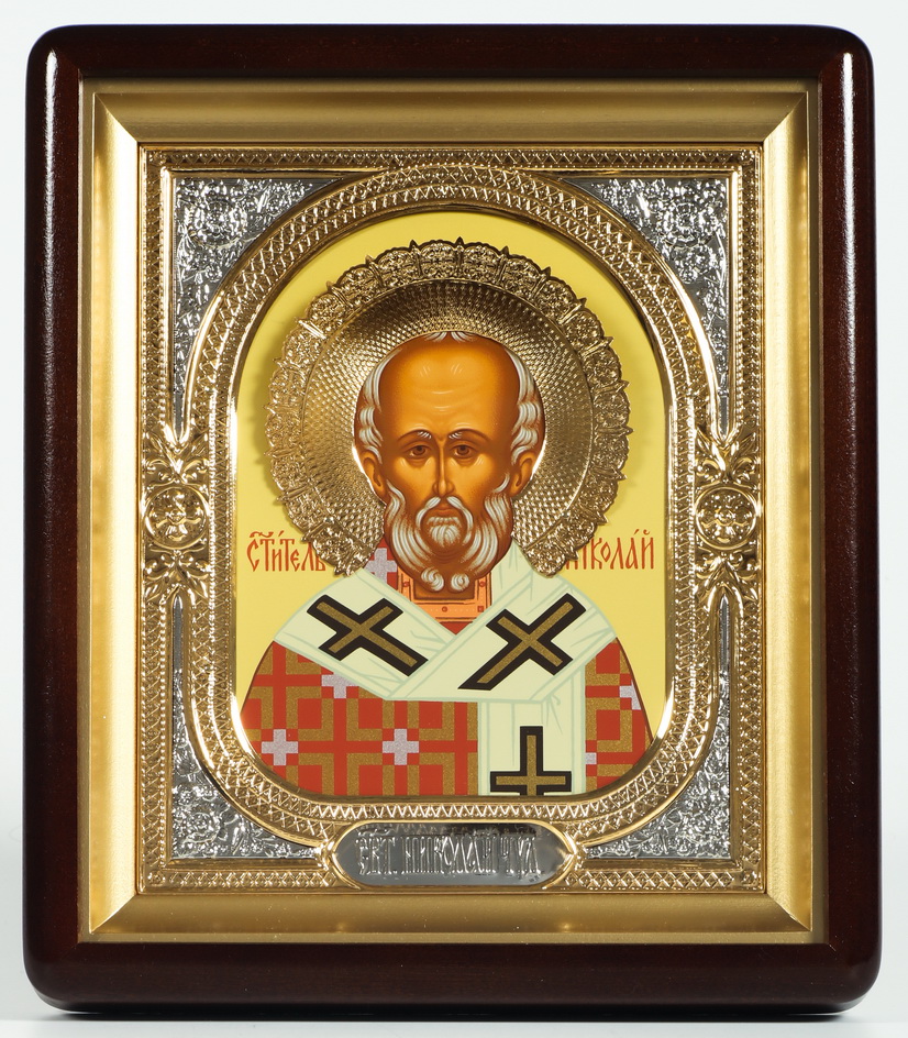 Икона в киоте 18х24 фигурный, темпера, венчик, риза-рамка объемная, открытая, золочение Николай Чудотворец