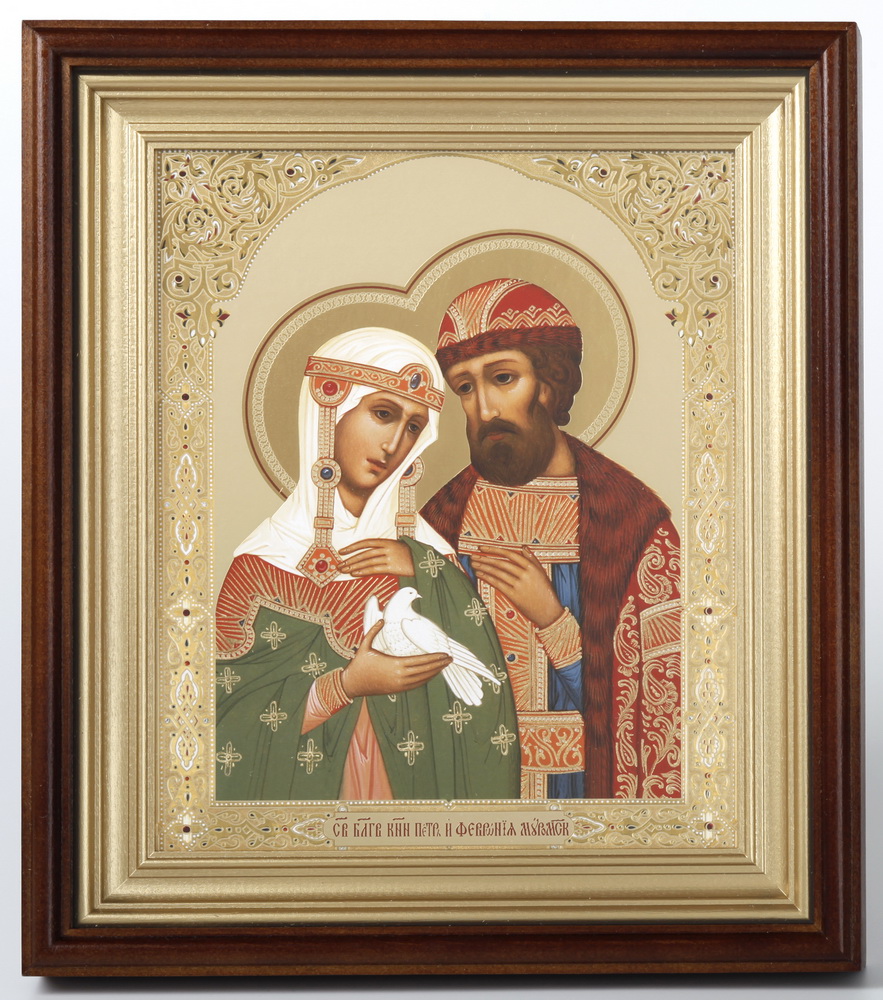 Икона в киоте 18х24 сложный, двойное тиснение Петр и Феврония 7