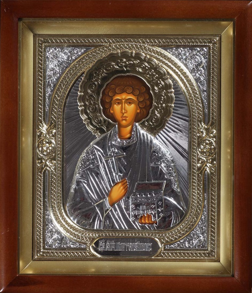 Икона в киоте 18х24 сложный, темпера, риза объёмная №1 Пантелеимон