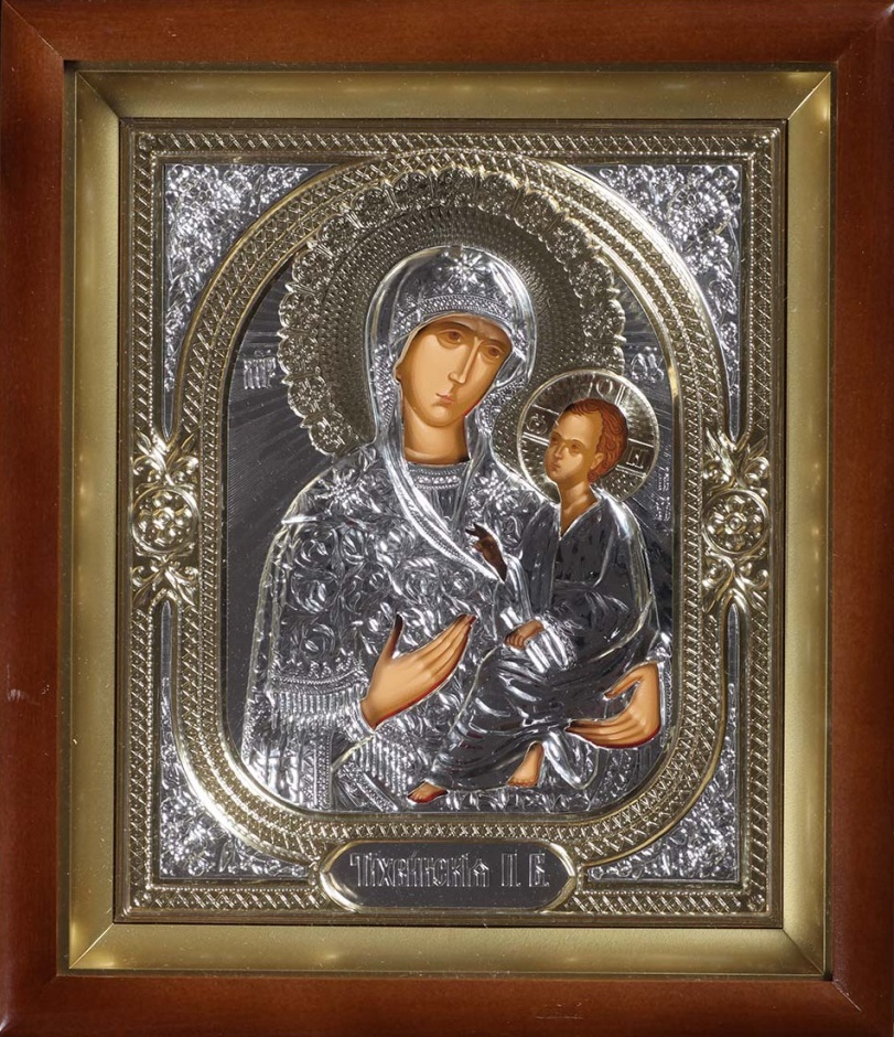 Икона в киоте 18х24 сложный, темпера, риза объёмная №1 Тихвинская БМ