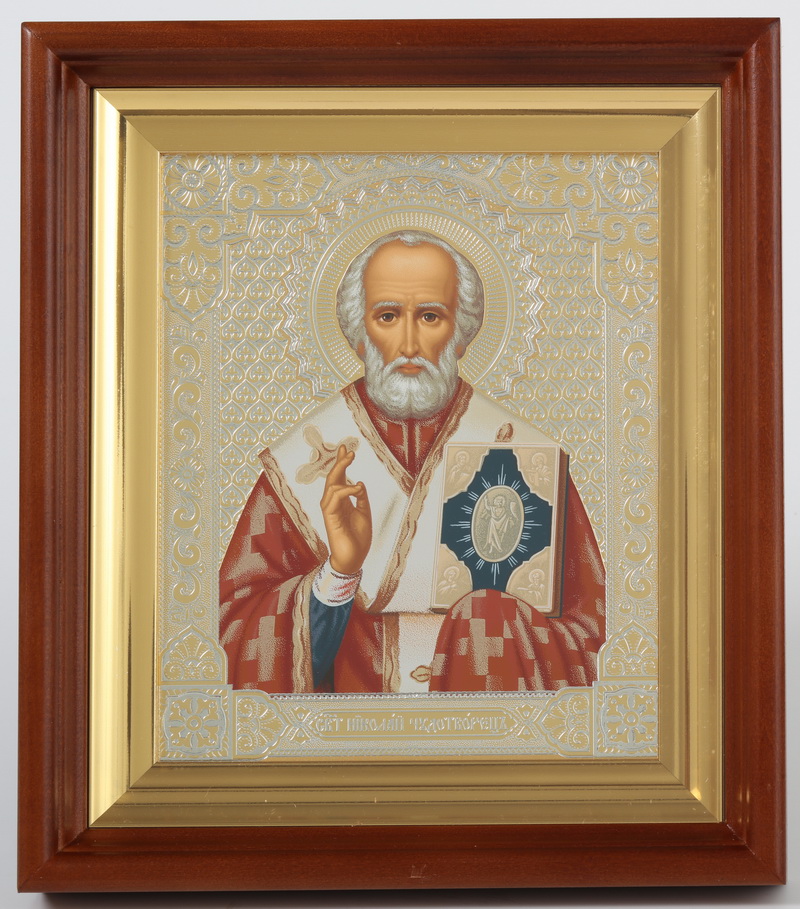 Икона в киоте 18х24 темпера, багетный подрамник Николай Чудотворец 1 (белый фон)