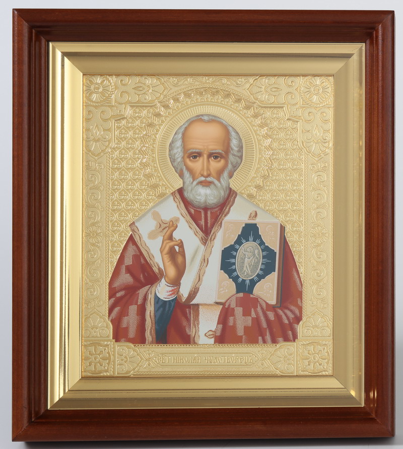 Икона в киоте 18х24 темпера, багетный подрамник Николай Чудотворец 1 (желтый фон)
