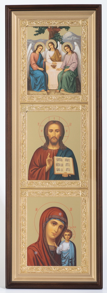 Икона в киоте 20х70 сложный, темпера, рамка золочёная Троица 1- Спаситель 1- Казанская БМ 1