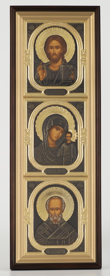 Икона в киоте 20х70 сложный, темпера, риза комбинированная (зол+патин.) Спаситель-Казанская БМ-Н.Чудотворец