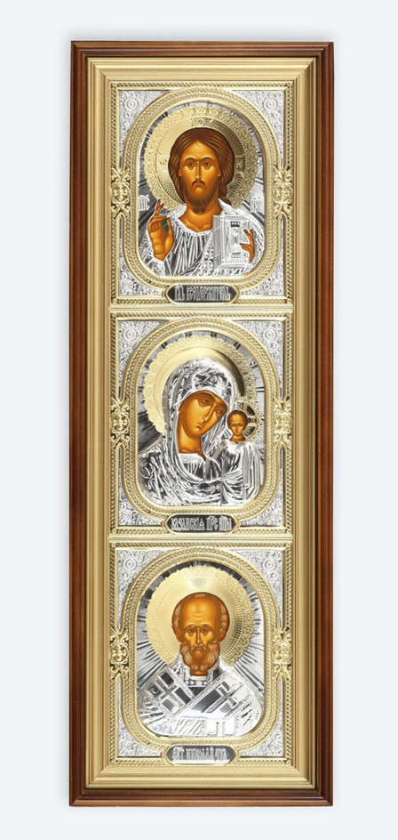 Икона в киоте 20х70 сложный, темпера, риза объёмная №1 Спаситель-Казанская БМ-Н.Чудотворец