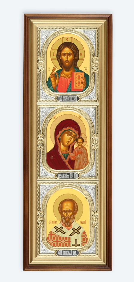 Икона в киоте 20х70 сложный, темпера, риза-рамка №1 Спаситель-Казанская БМ-Н.Чудотворец