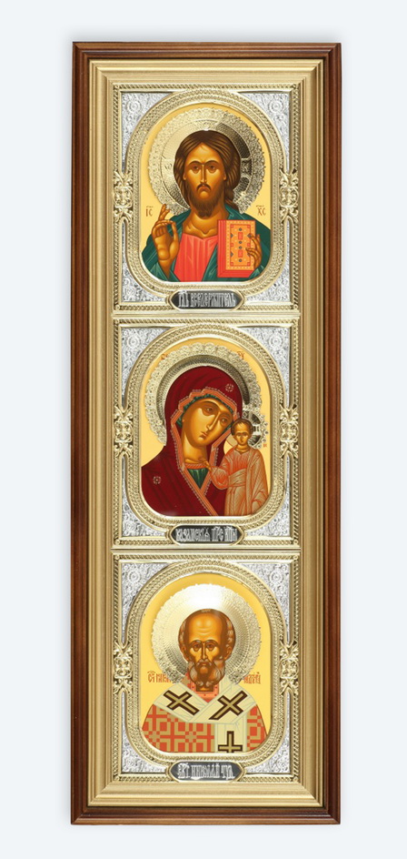 Икона в киоте 20х70 сложный, темпера, венчик, риза-рамка №1 Спаситель-Казанская БМ-Н.Чудотворец
