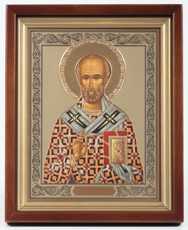 Икона в киоте 22х26 сложный, тройное тиснение, венчик золоченый Николай Чудотворец