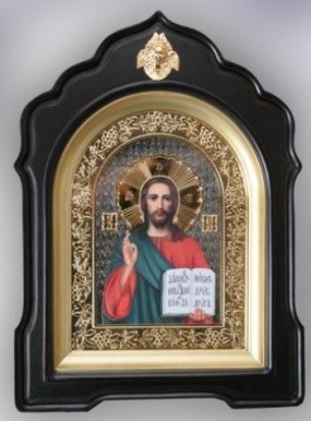 Икона в киоте 24х30 фигурный, арочный, фото, риза объемная открытая, золочение Спаситель