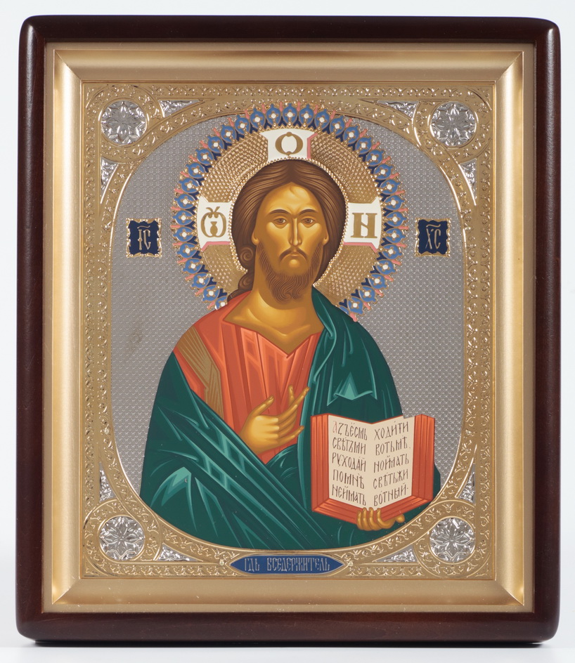 Икона в киоте 24х30 фигурный, темпера, риза объемная, открытая, золочение, эмаль Спаситель