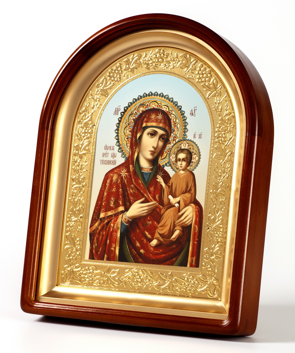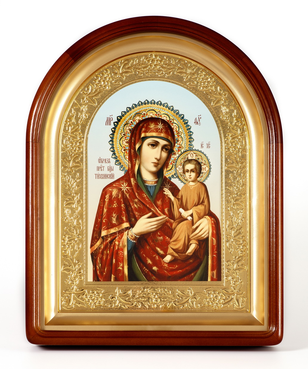 Икона в киоте 24х30 сложный, арочный, фото, рамка золочёная Божией Матери «Тихвинская»
