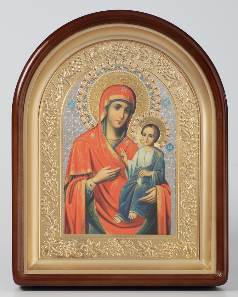 Икона в киоте 24х30 сложный, арочный, фото, риза объемная, открытая, золочение, эмаль Иверская БМ