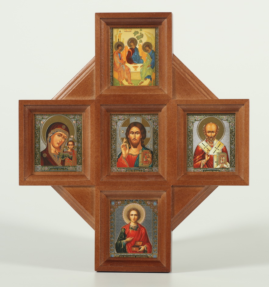 Икона в киоте 6х7 многоместная, двойное тиснение, 5 икон Троица Спаситель Казанская Ник.Чудотв. Пантелеимон
