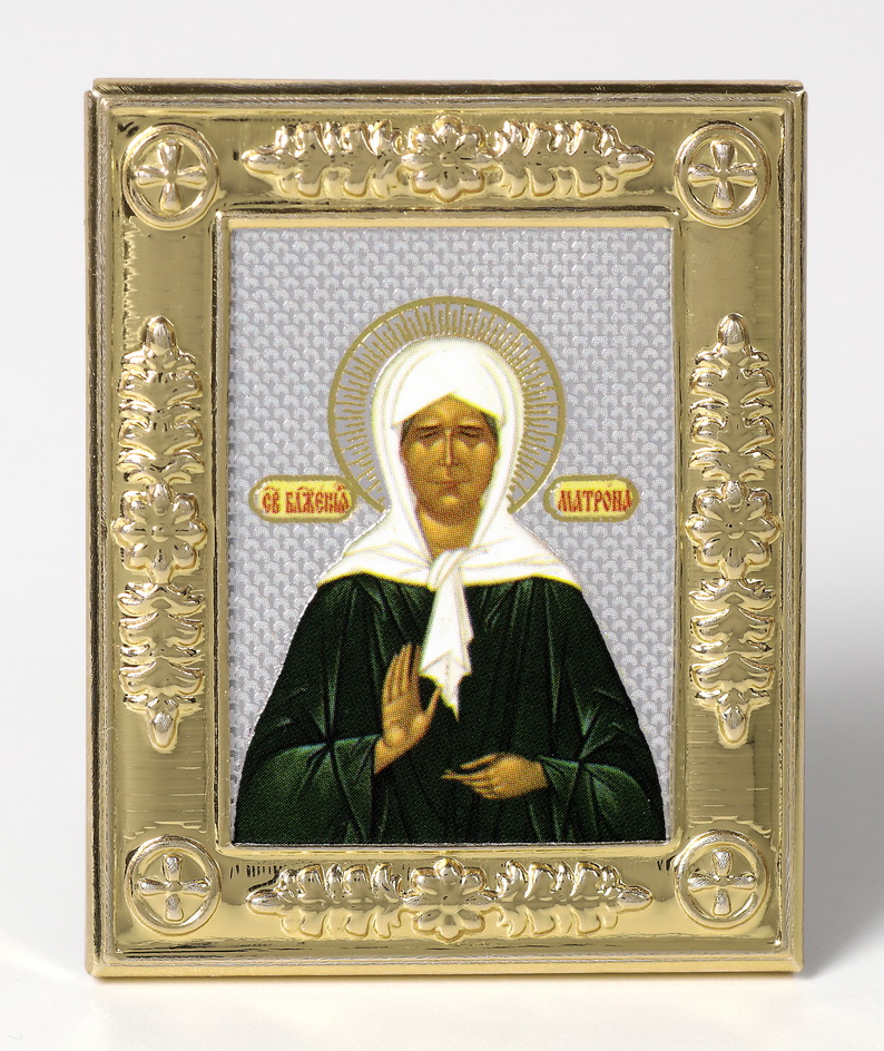 Икона святой блаженной Матроны Московской в золотой металлической рамке отлично подойдет для размещения в домашнем иконостасе.