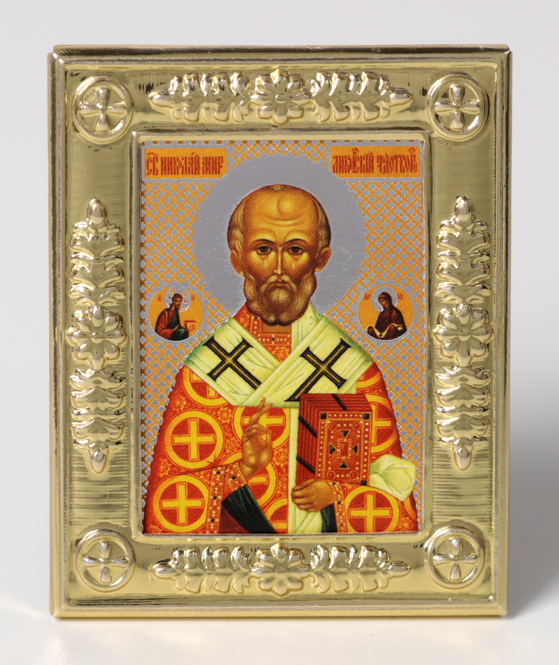 Благодаря наклейке на обороте, икона святого Николая Чудотворца в металлической рамке подойдет для размещения в автомобиле.