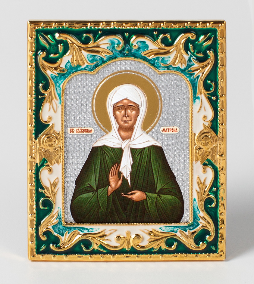Икона святой блаженной Матроны в металлической рамке, покрытой эмалью, отлично подойдет для размещения в домашнем иконостасе.
