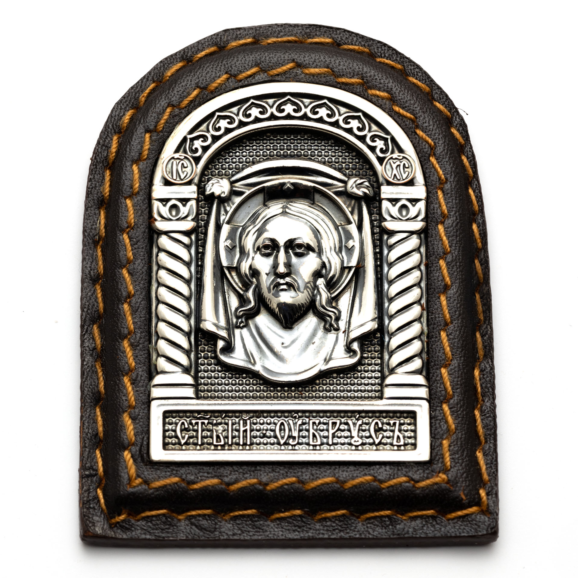 Икона в металлической рамке автомобильная на липкой ленте г / пластика кожа серебрение чернение Спас Нерукотворный