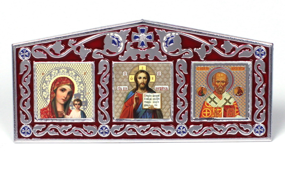 Икона в металлической рамке тройник на липкой ленте №1, эмаль Спаситель-Казанская БМ-Николай Чудотвор.