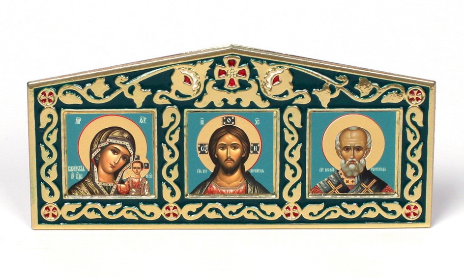 На данной иконе объединены сразу три образа: Божией Матери «Казанская», Господа Вседержителя и Николая Чудотворца. Благодаря наклейке на обороте, эта икона будет особенно удобна для размещения в автомобиле.
