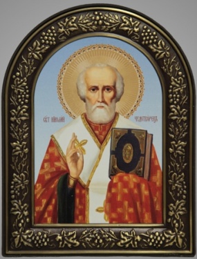 Икона в пластмассовой рамке 18х24 арочная патинирование Николай Чудотворец 1