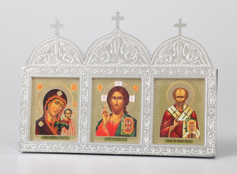 Икона в пластмассовой рамке 4,5х12 тройная с липкой лентой Казанская - Спаситель - Николай Чудотворец