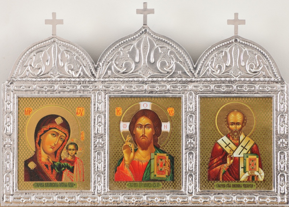 Икона в пластмассовой рамке 4,5х12 тройная с подставкой Казанская - Спаситель - Николай Чудотворец