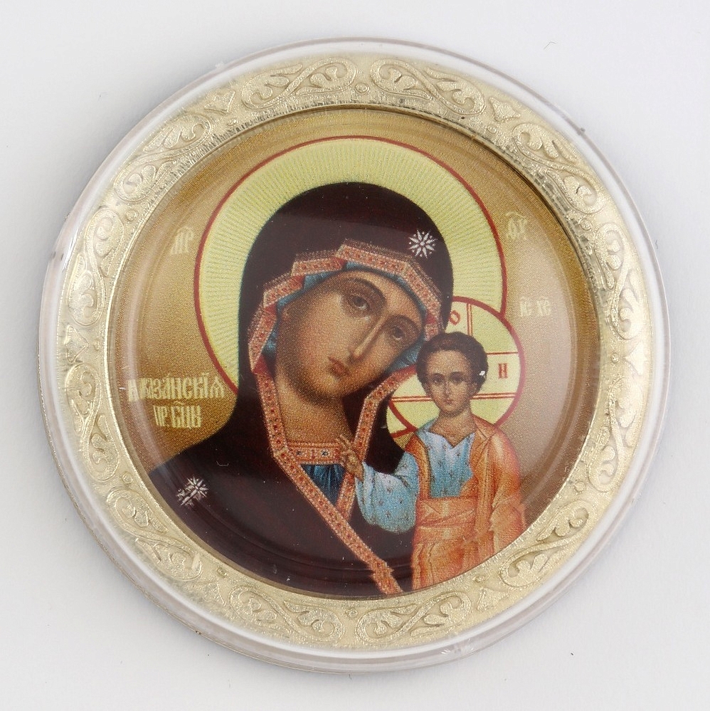 Икона в пластмассовой рамке 4х5 круглая №2 Казанская БМ 2