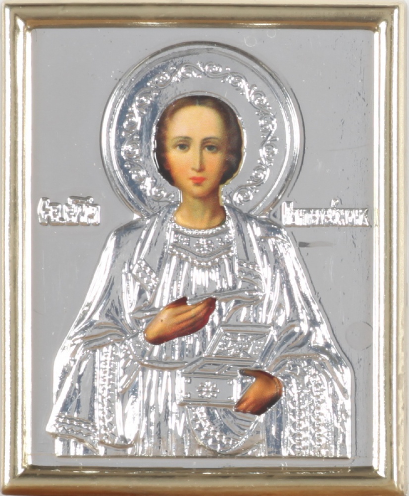 Икона в пластмассовой рамке 4х5 металлизированная риза Пантелеимон