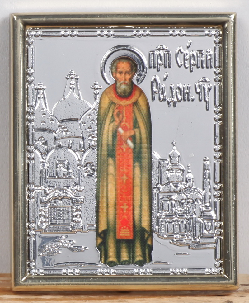 Икона в пластмассовой рамке 4х5 металлизированная риза Сергий Радонежский (ростовой)