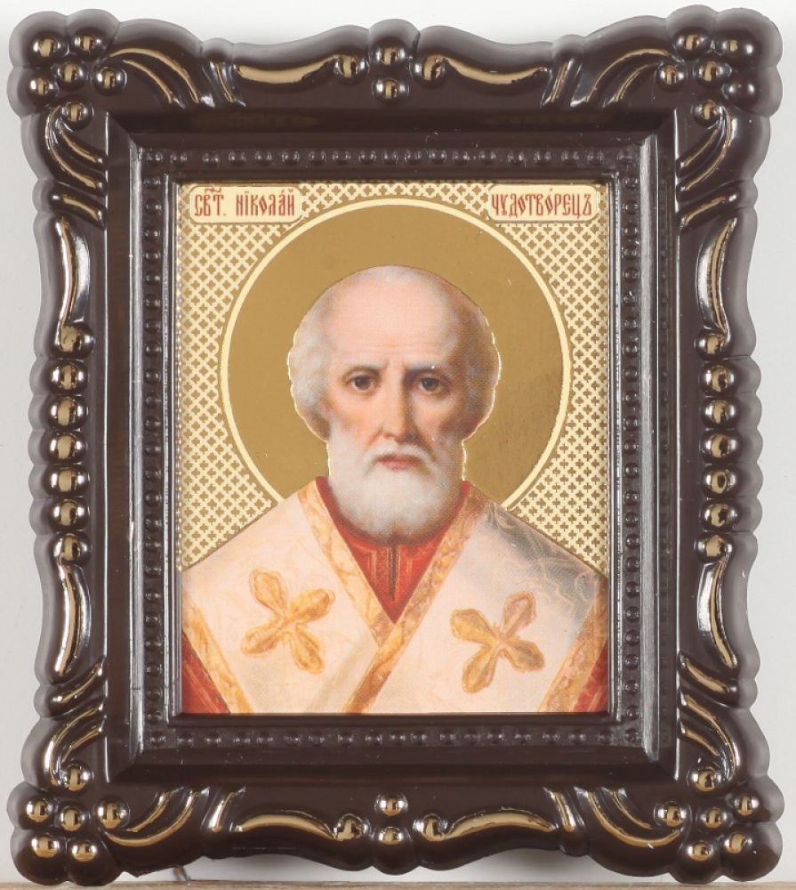 Икона в пластмассовой рамке 5х6 ажурная Николай Чудотворец