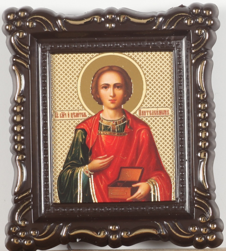 Икона в пластмассовой рамке 5х6 ажурная Пантелеимон
