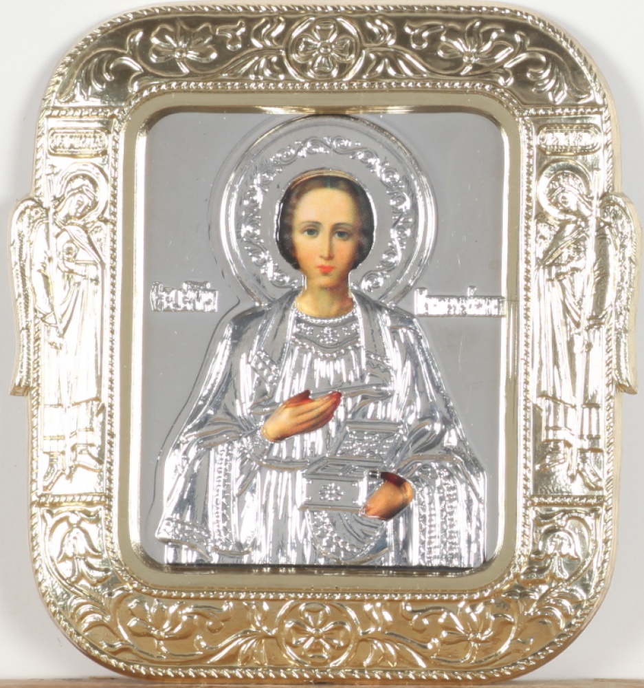 Икона в пластмассовой рамке 5х6 металлизированная риза Пантелеимон