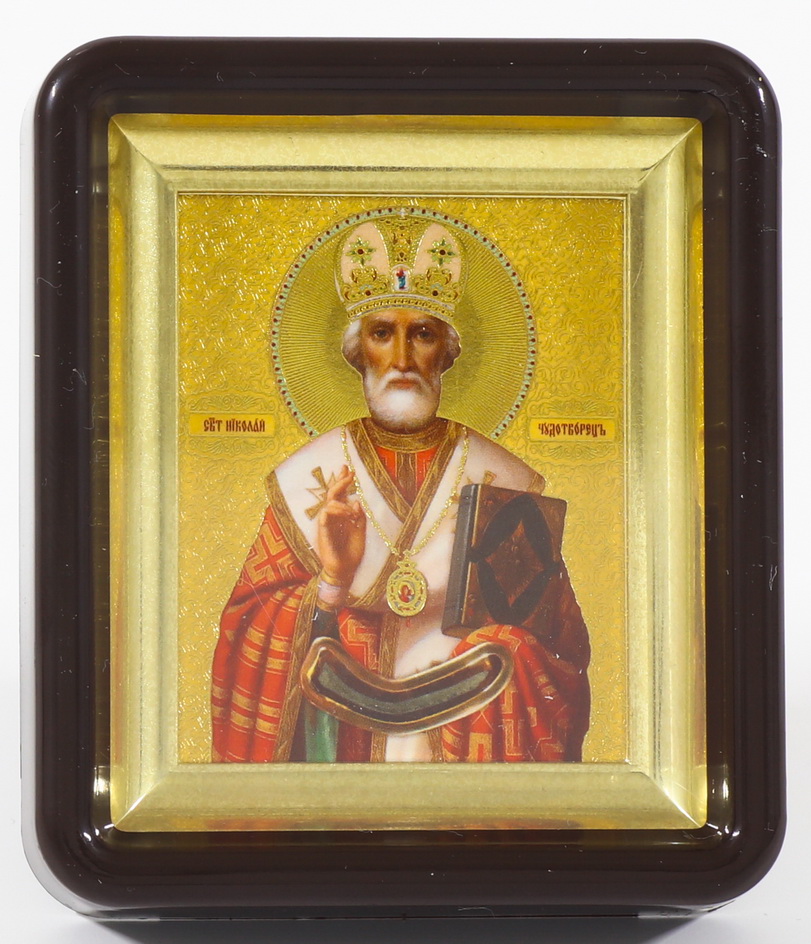 Икона в пластмассовой рамке 6х7 латунированная Николай Чудотворец (ковчег)