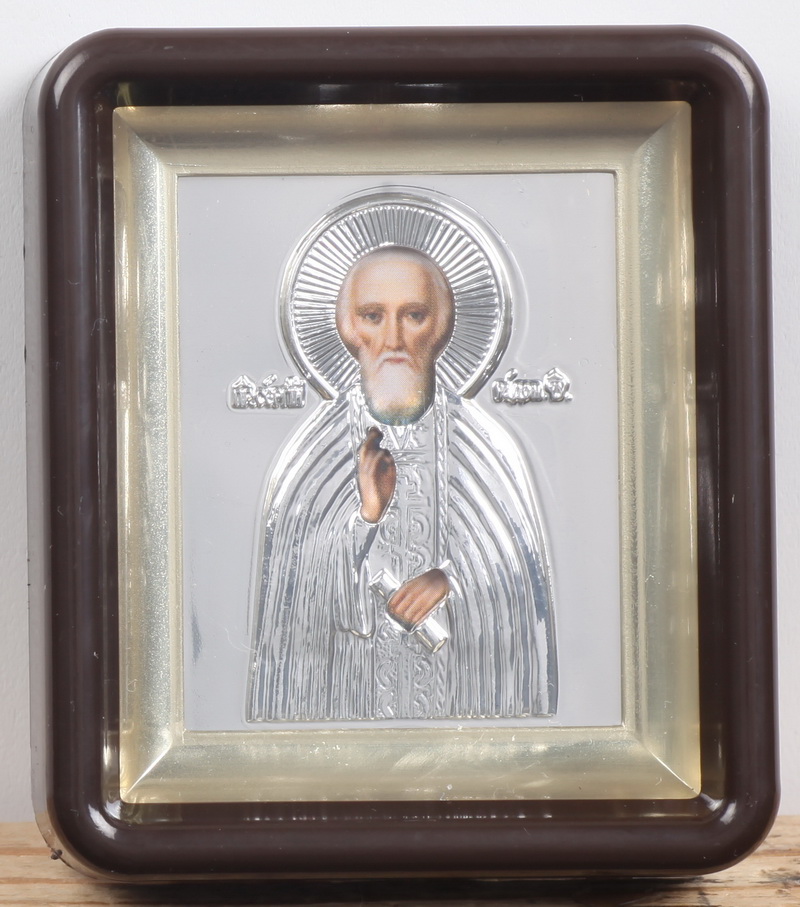 Икона в пластмассовой рамке 6х7 латунированная риза Сергий Радонежский (поясной)