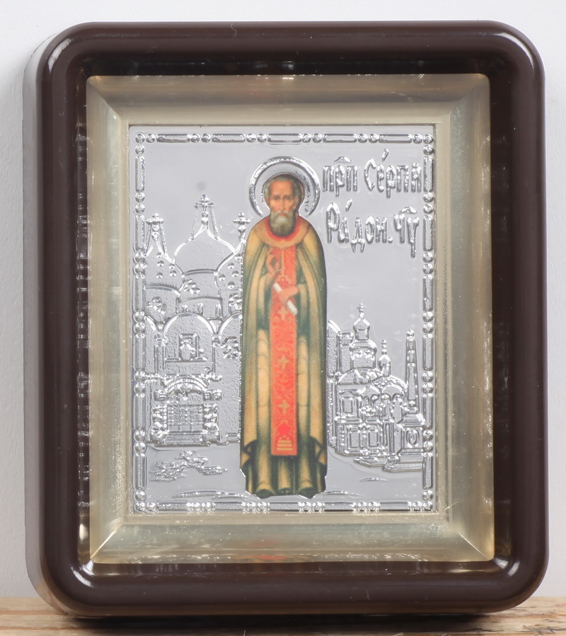 Икона в пластмассовой рамке 6х7 латунированная риза Сергий Радонежский (ростовой)