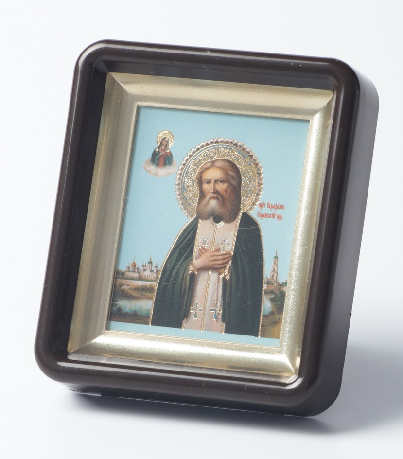 Икона в пластмассовой рамке 6х7 латунированная Серафим Саровский 2