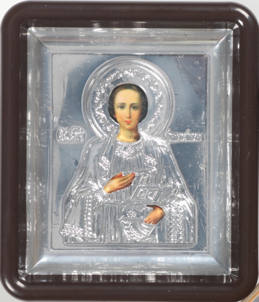 Икона в пластмассовой рамке 6х7 металлизированная риза Пантелеимон