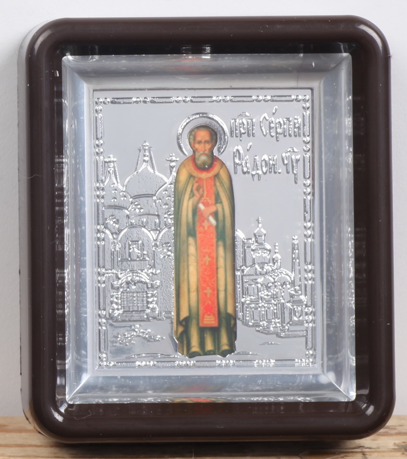 Икона в пластмассовой рамке 6х7 металлизированная риза Сергий Радонежский (ростовой)