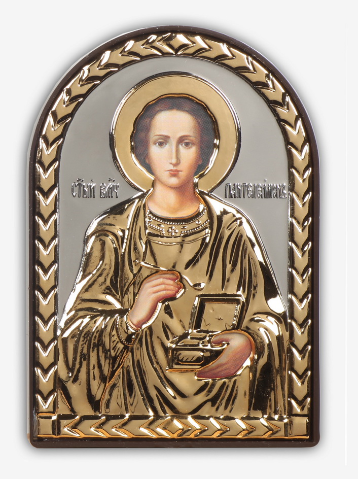 Икона в пластмассовой рамке 6х9 арочная риза №2 Пантелеимон