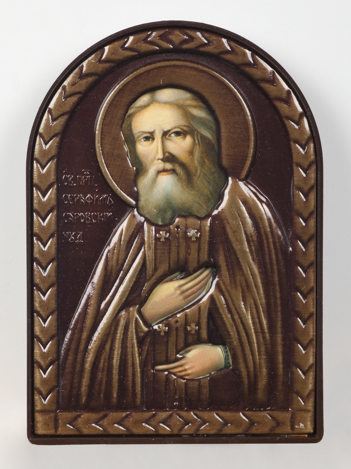Икона в пластмассовой рамке 6х9 арочная риза №3 Серафим Саровский