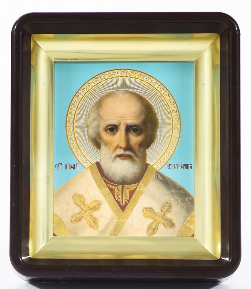 Икона в пластмассовой рамке Киот 11х13 латун. подрамник Николай Чудотворец 7