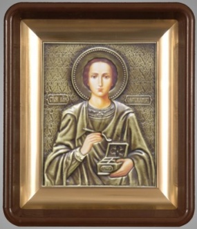 Икона в пластмассовой рамке Киот 11х13 латун. подрамник риза патинированная Пантелеимон